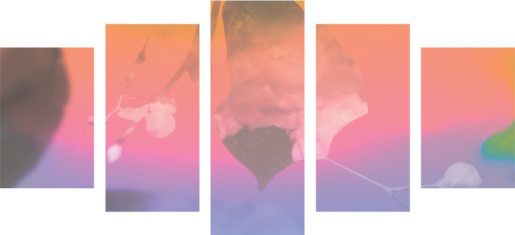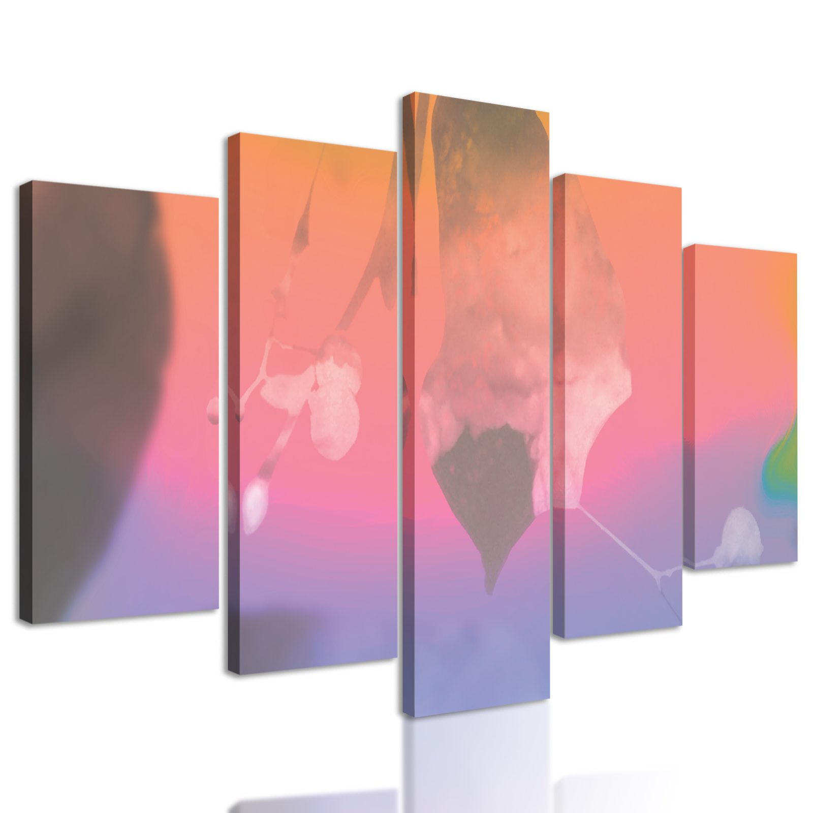 5-dielny obraz slnko predierajúce sa medzi korunami stromov v čiernobielom prevedení