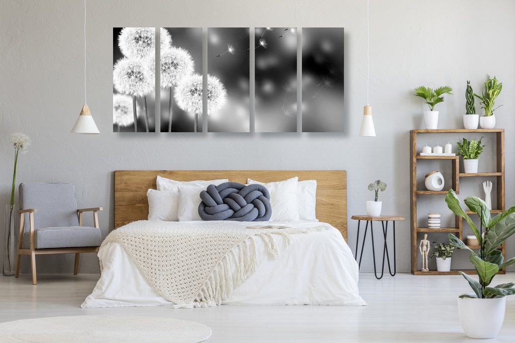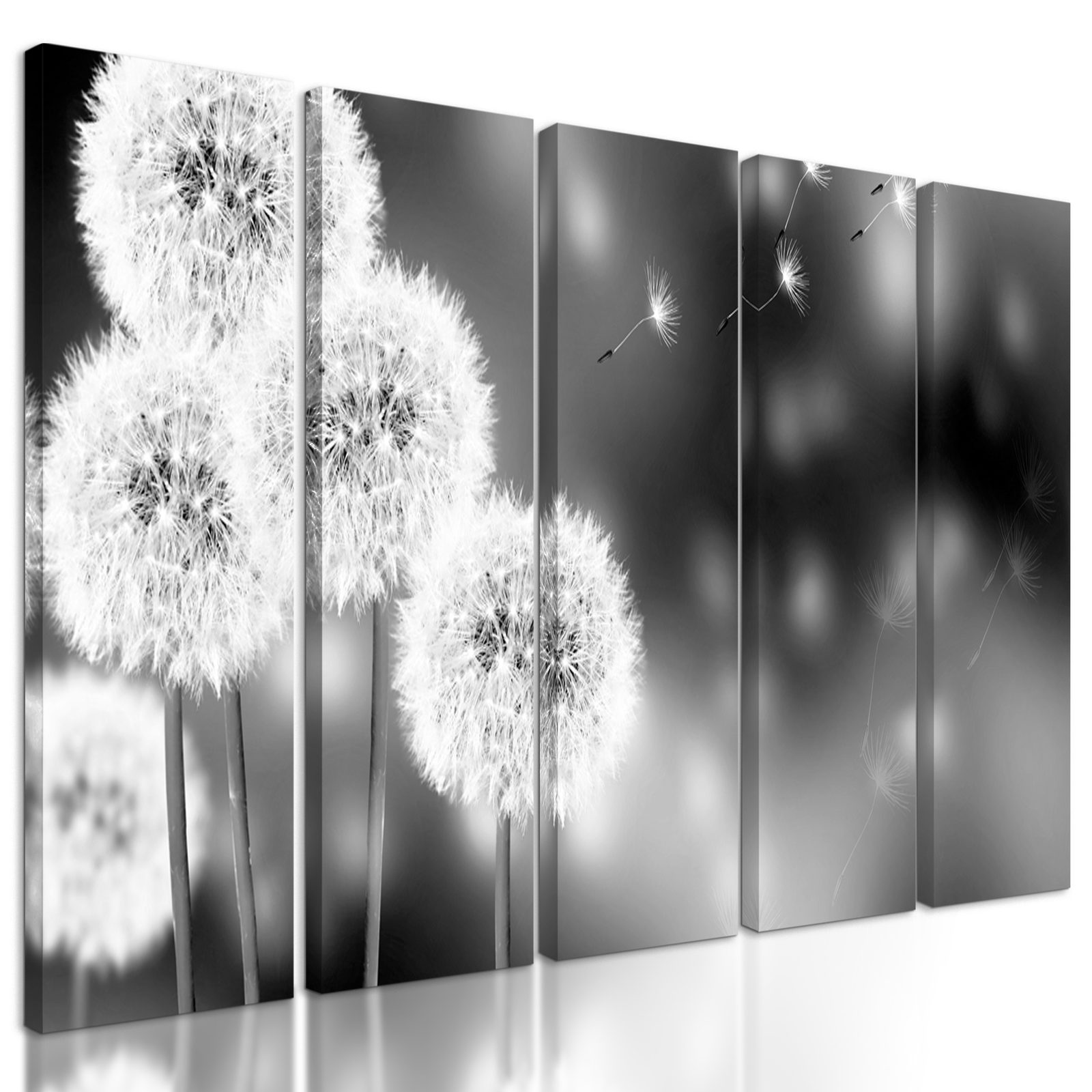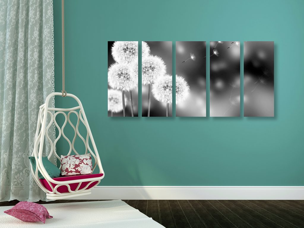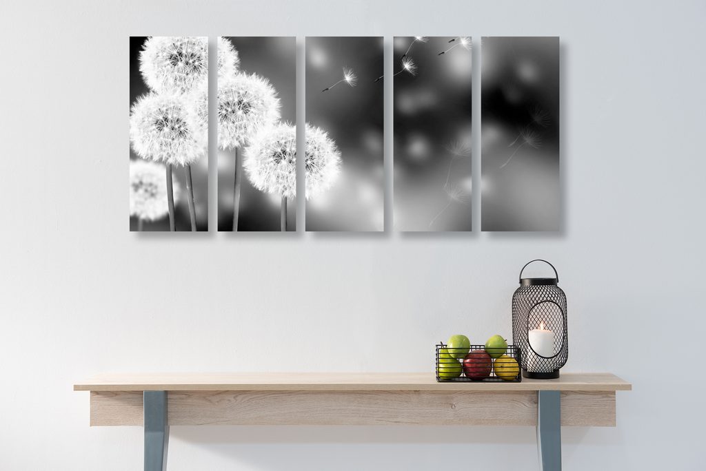 5-dielny obraz nadýchané klobúčiky púpavy v čiernobielom prevedení