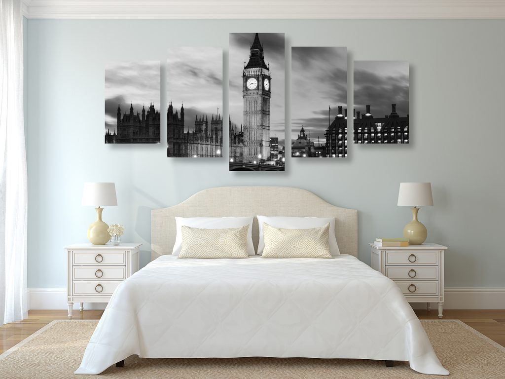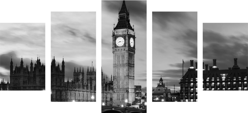 5-dielny obraz nasvietený Big Ben v čiernobielom prevedení