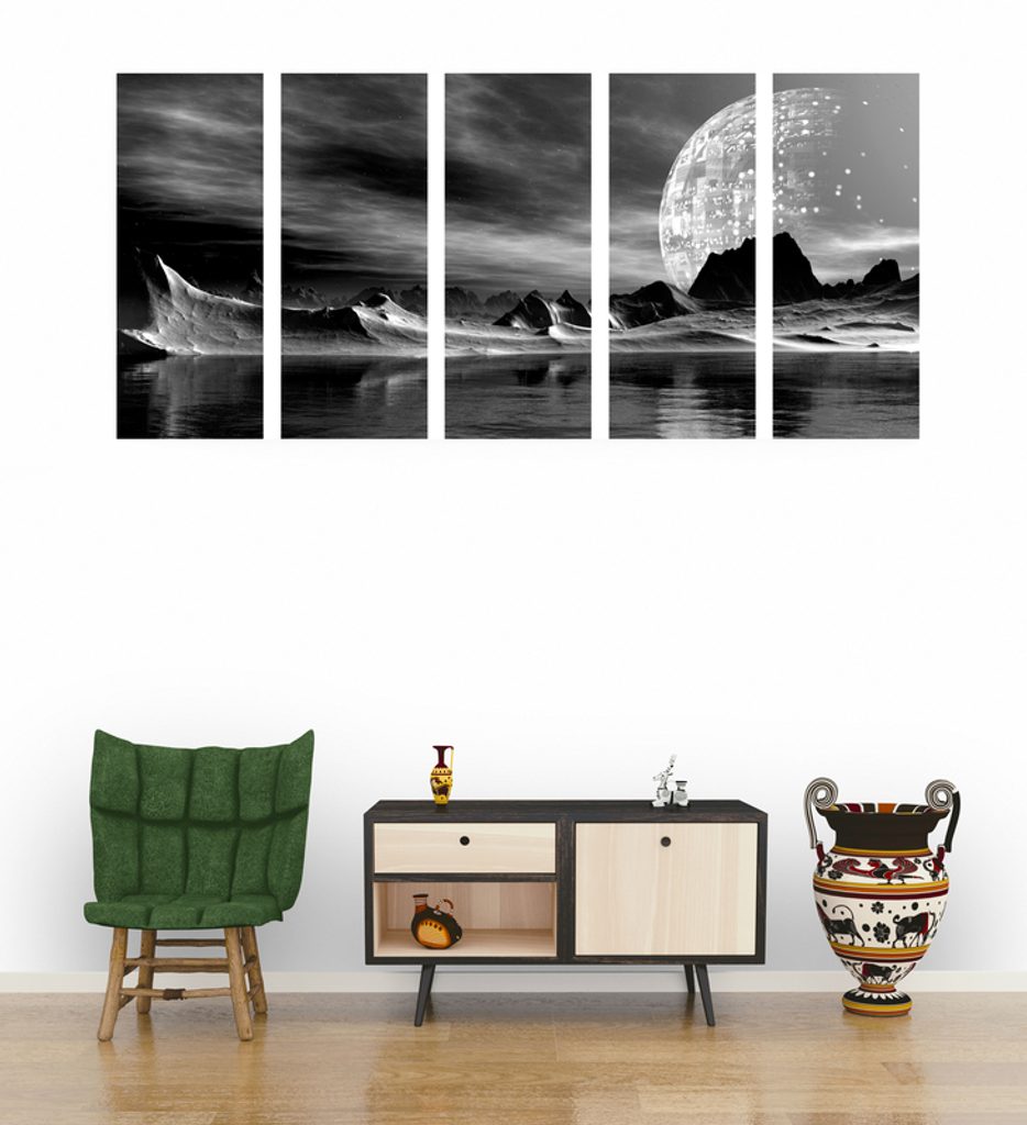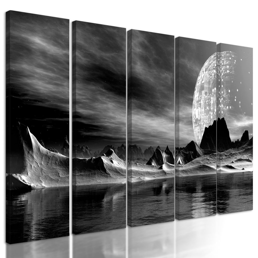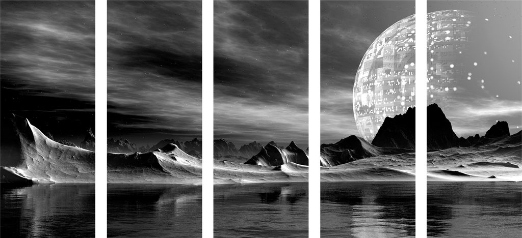 5-dielny obraz neznáma planéta v čiernobielom prevedení