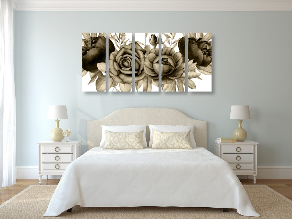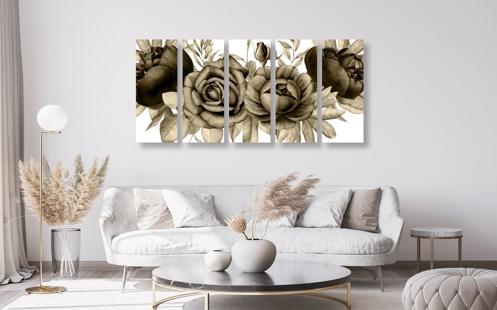 5-dielny obraz nežné splynutie ruží a listov v sépiovom prevedení
