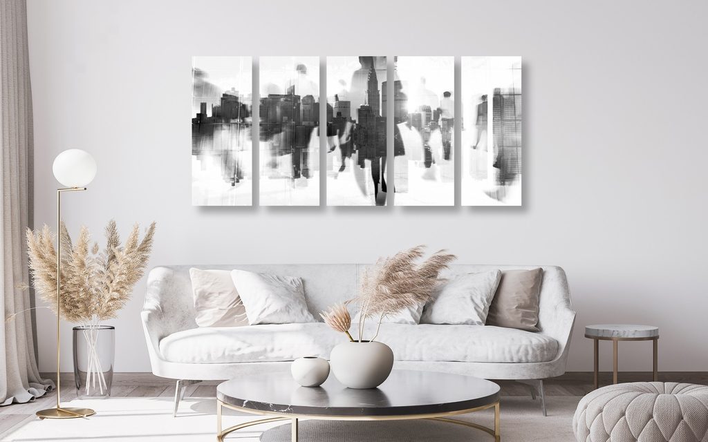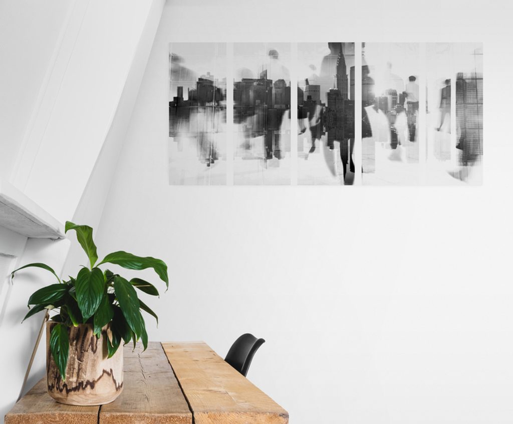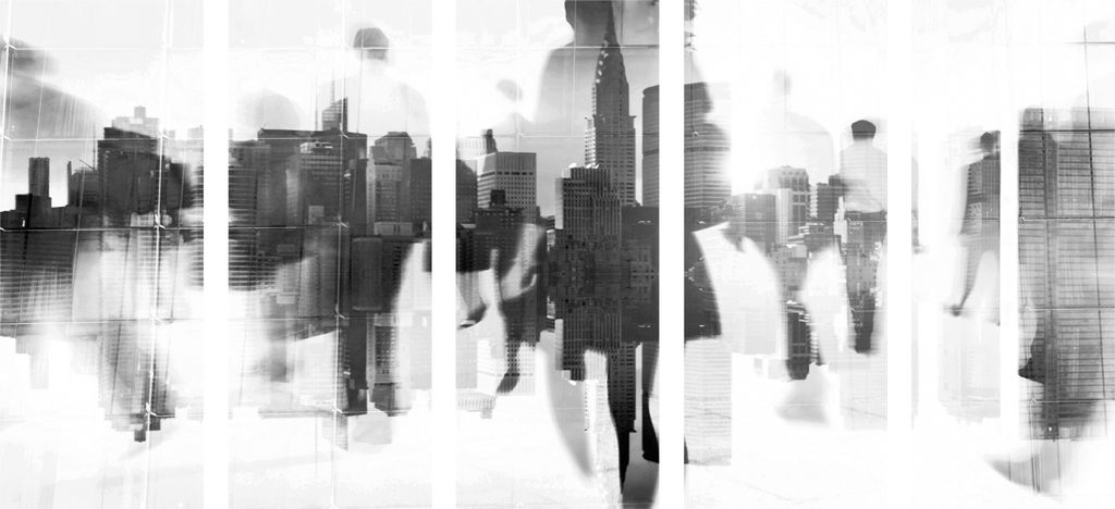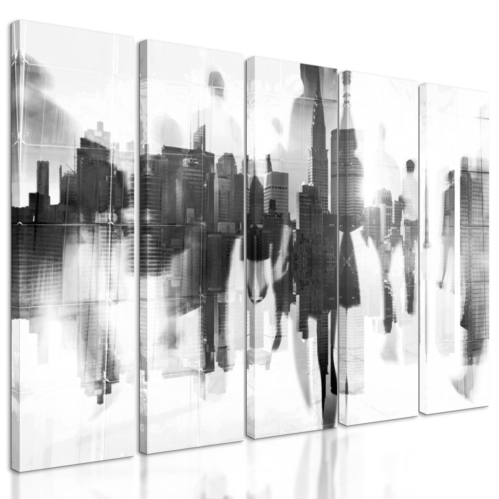 5-dielny obraz odrazy ľudí v rušnom meste v čiernobielom prevedení