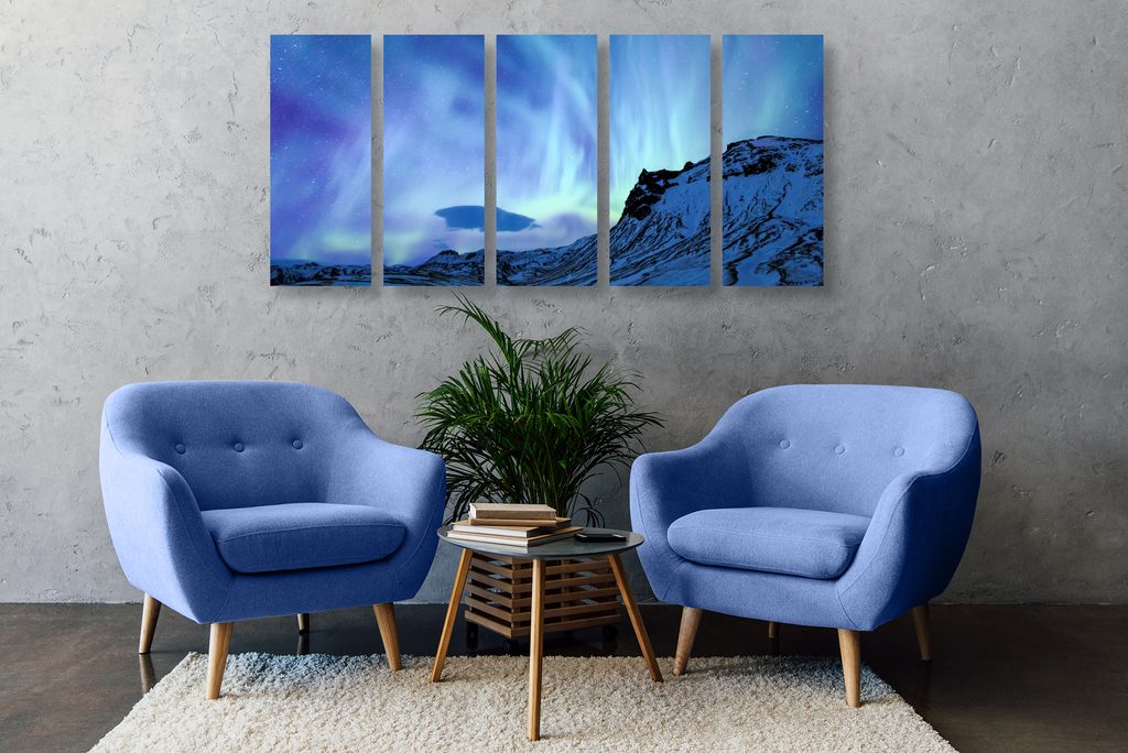 5-dielny obraz okuzľujúca polárna žiara nad krajinou