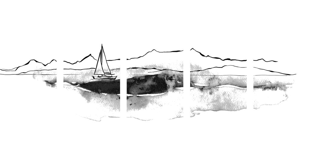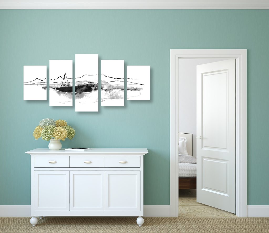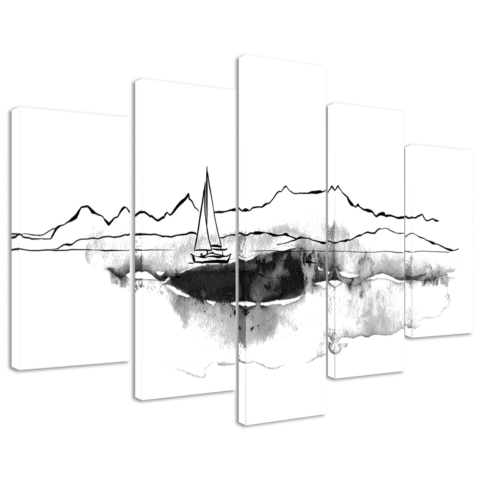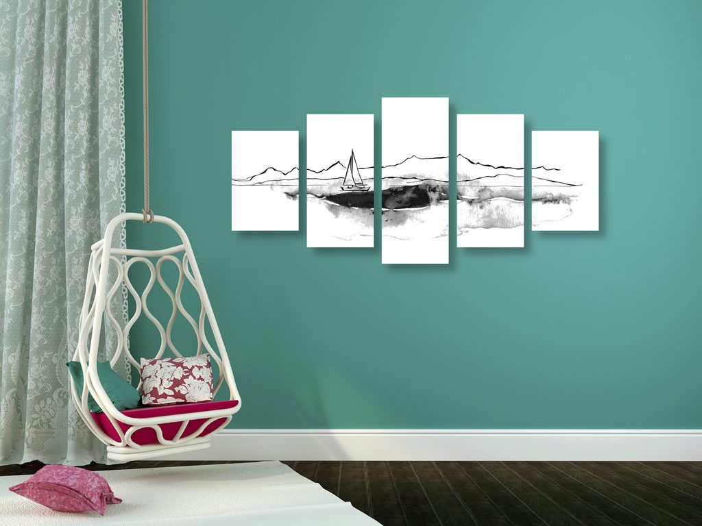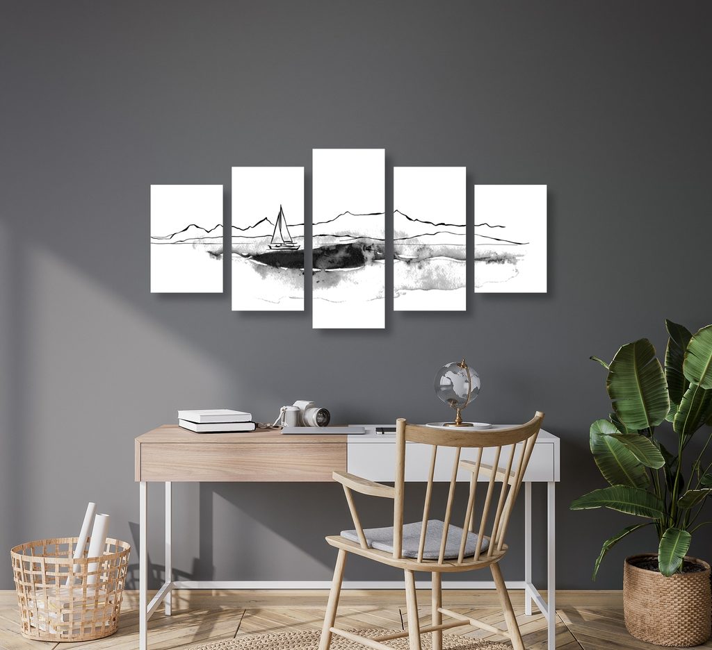 5-dielny obraz osamelá jachta v čiernobielom prevedení