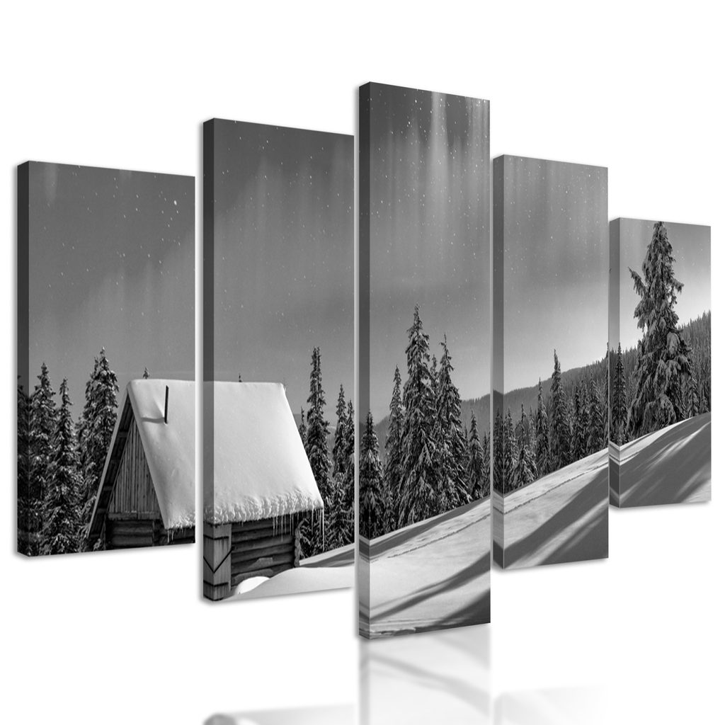 5-dielny obraz polárna žiara nad zimnou krajinou v čiernobielom prevedení