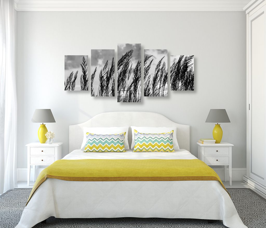 5-dielny obraz poľná tráva s nebeským pozadím v čiernobielom prevedení