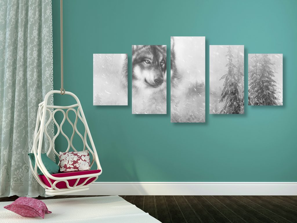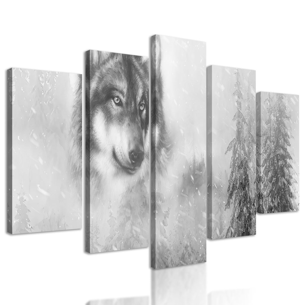 5-dielny obraz portrét vlka v čiernobielom prevedení