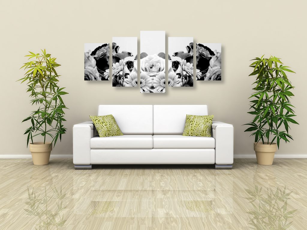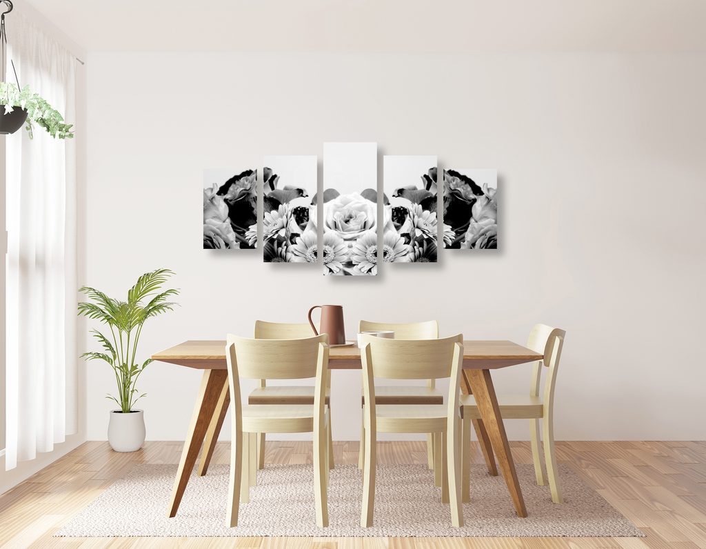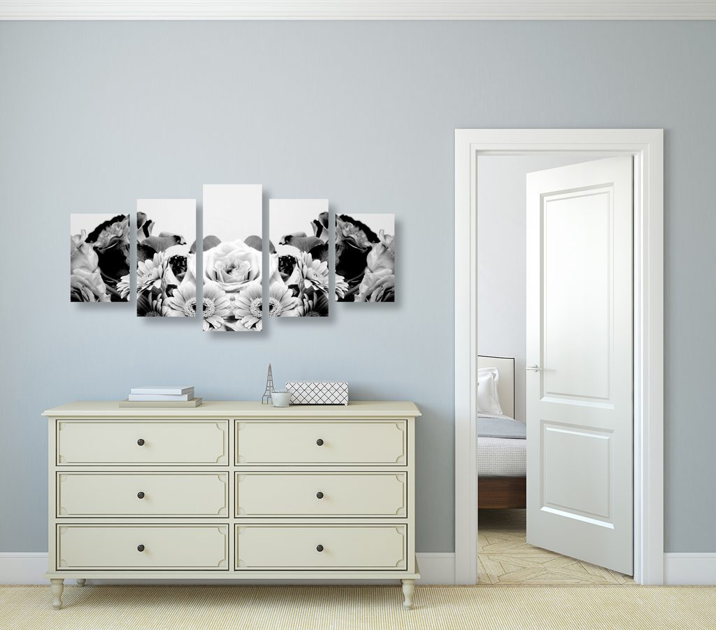 5-dielny obraz pôvabná kvetinová kompozícia v čiernobielom prevedení