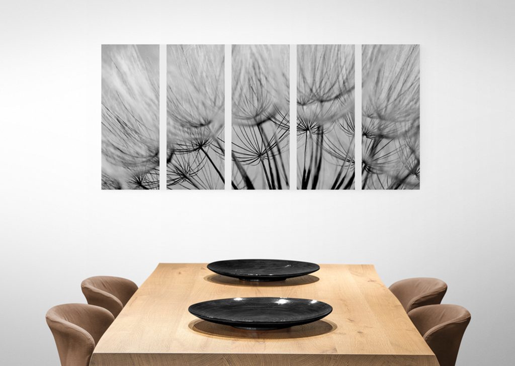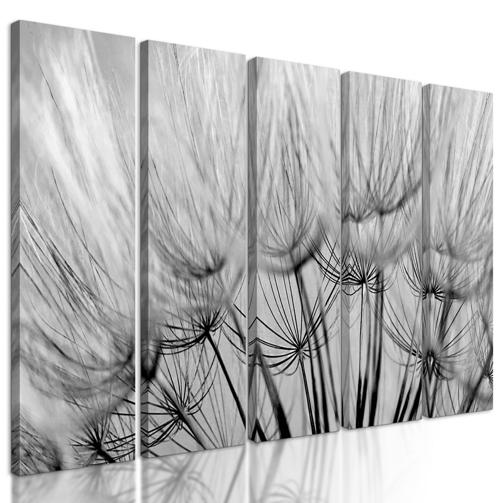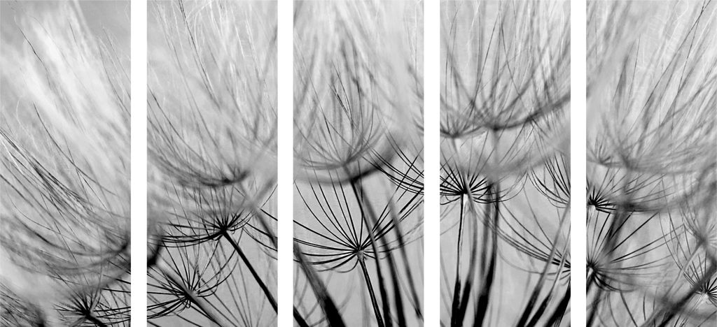 5-dielny obraz presný detail púpavy v čiernobielom prevedení