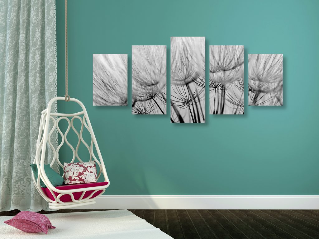 5-dielny obraz presný detail púpavy v čiernobielom prevedení