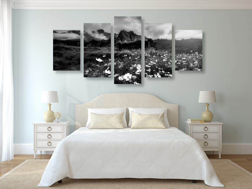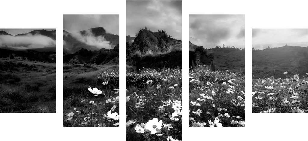 5-dielny obraz rozkvitnutá lúka v čiernobielom prevedení