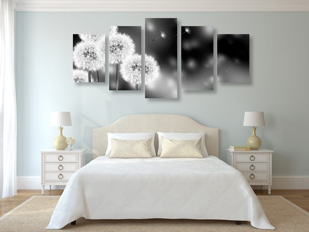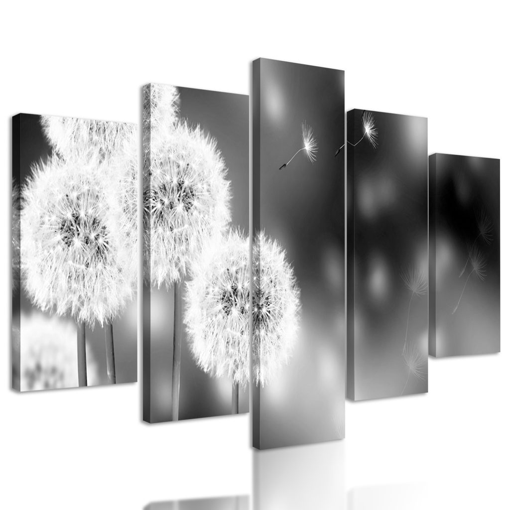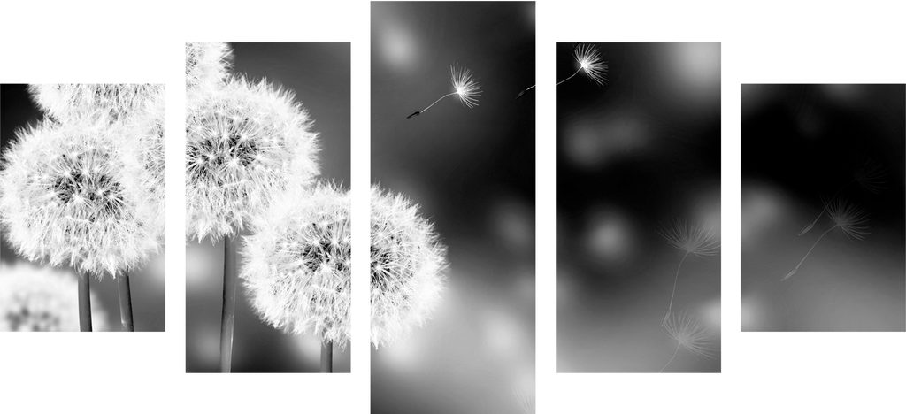 5-dielny obraz rozkvitnutá púpava v čiernobielom prevdení