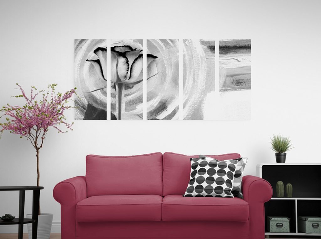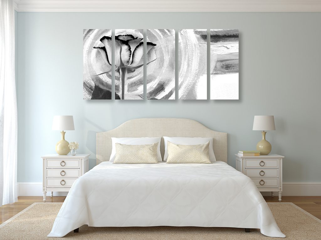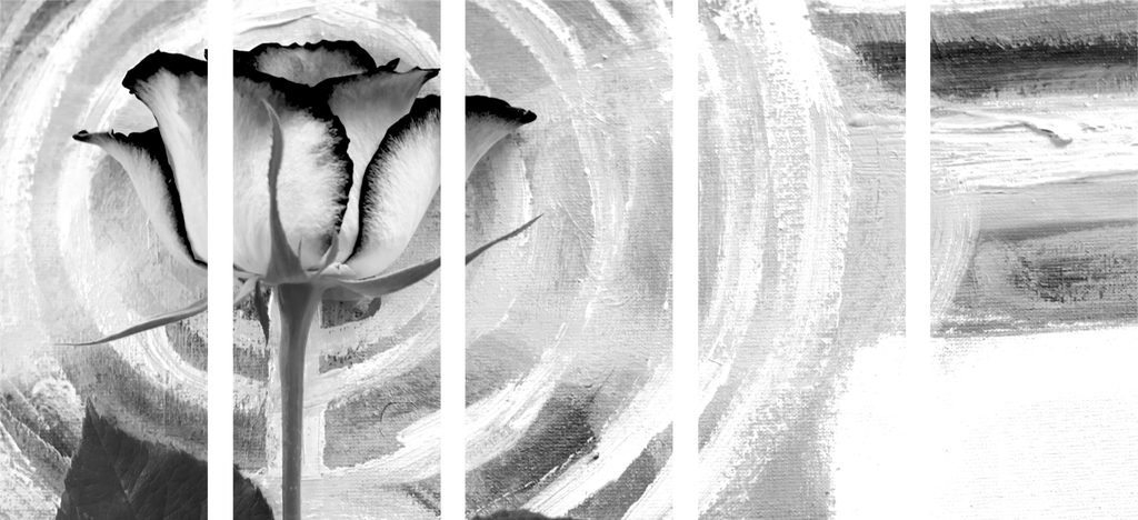5-dielny obraz ruža na maľovanom pozadí v čiernobielom prevedení