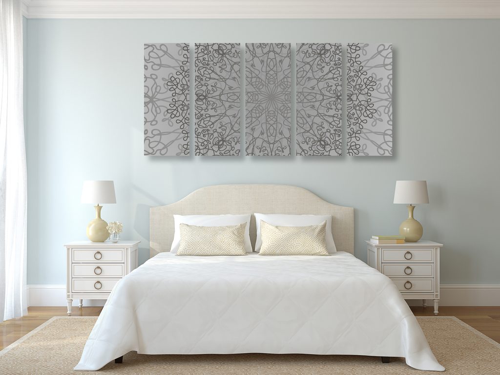5-dielny obraz snehobiela Mandala s tmavo-modrým pozadím