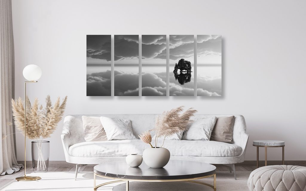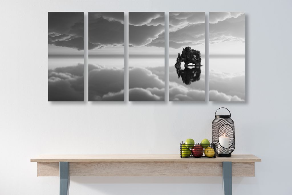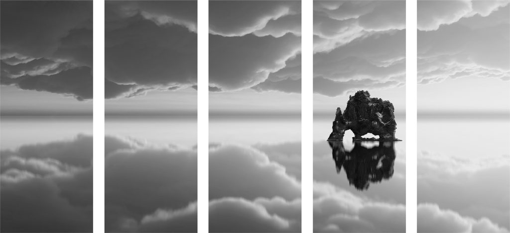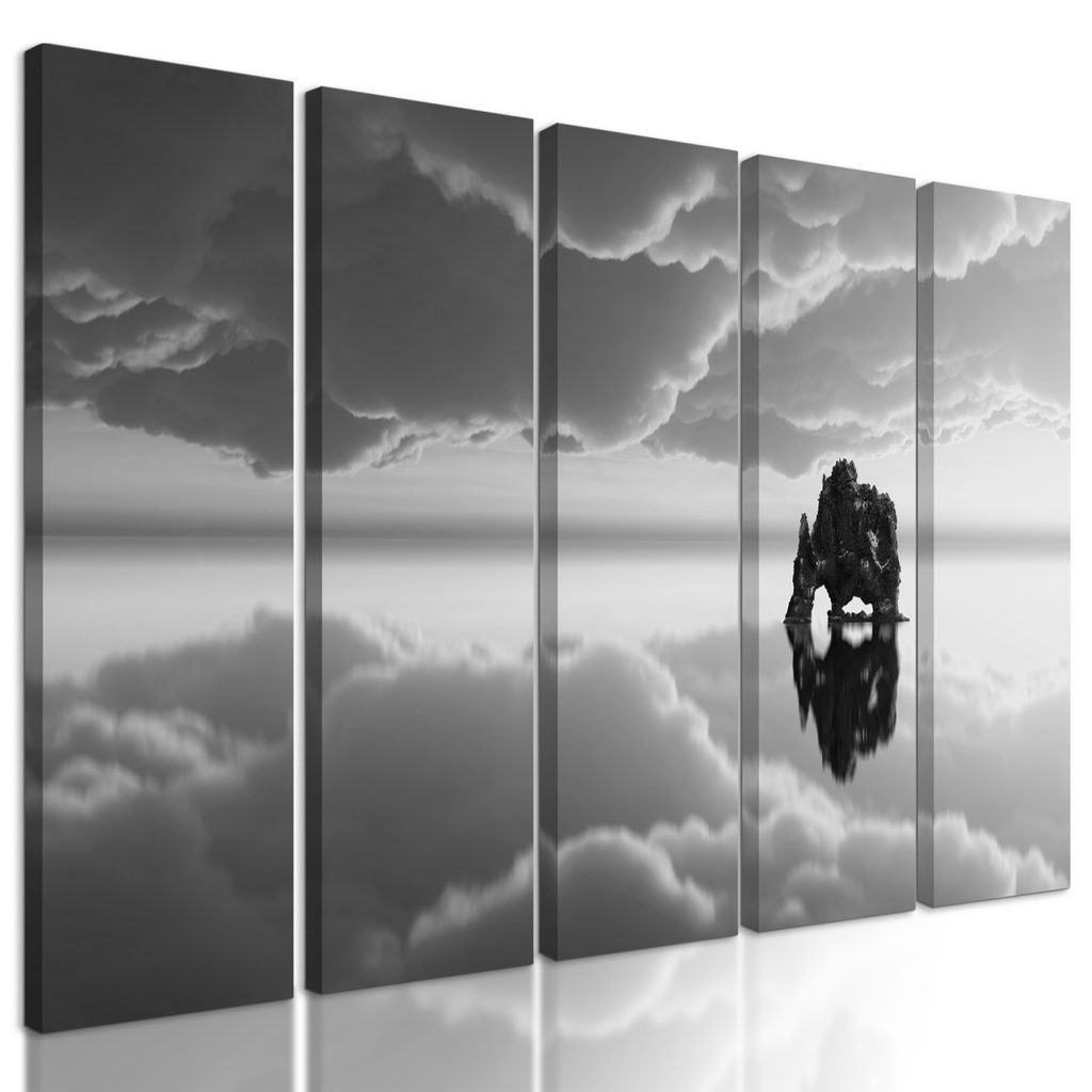 5-dielny obraz skala uprostred mora v čiernobielom prevedení