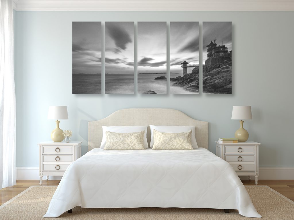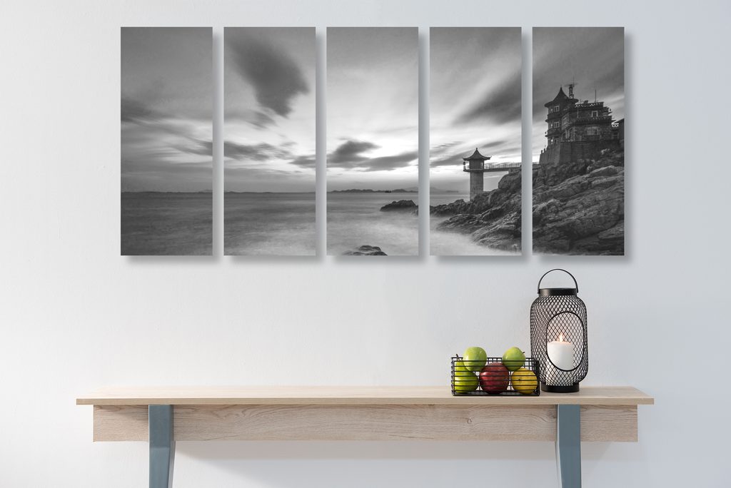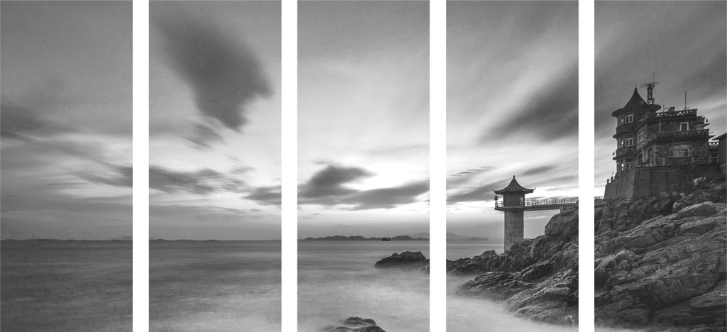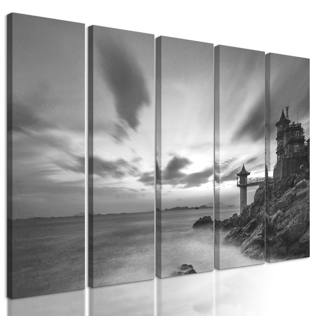 5-dielny obraz slnko zapadajúce za maják v čiernobielom prevedení