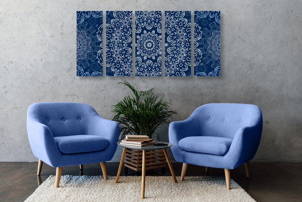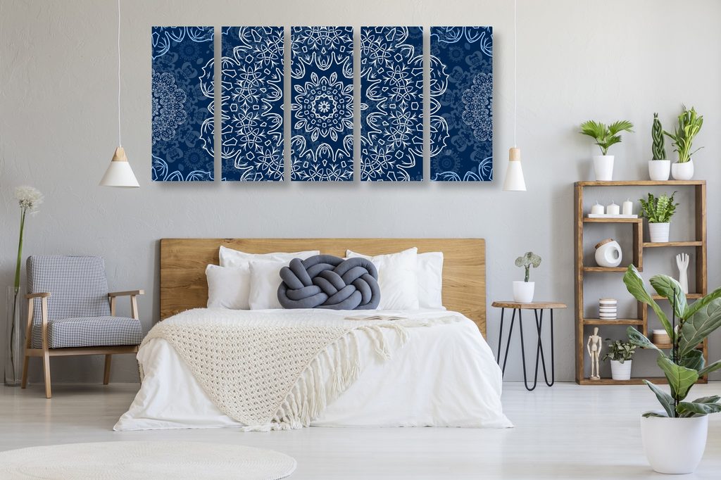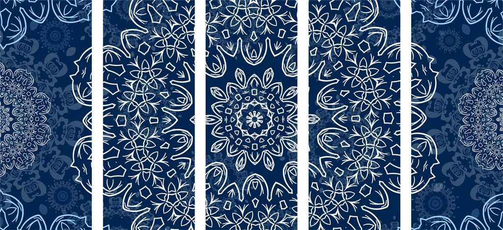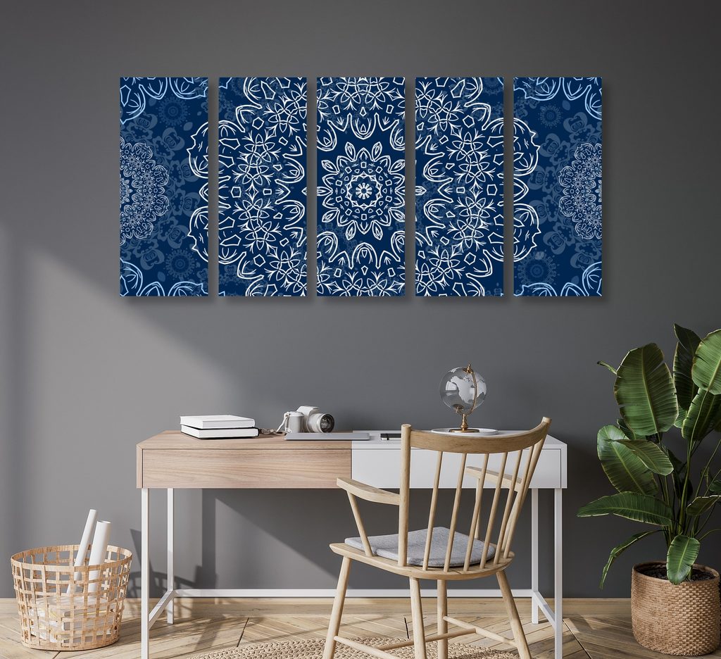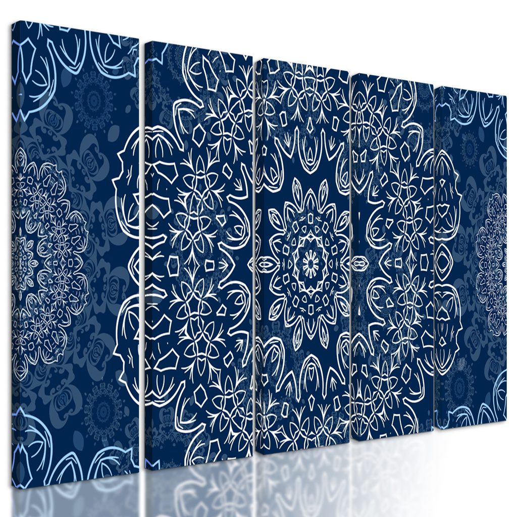 5-dielny Obraz snehobiela Mandala s tmavo-modrým pozadím