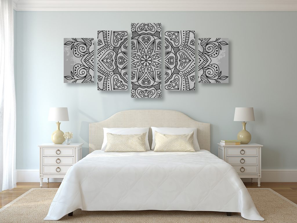 5-dielny obraz starodávna Mandala v čiernobielom prevedení
