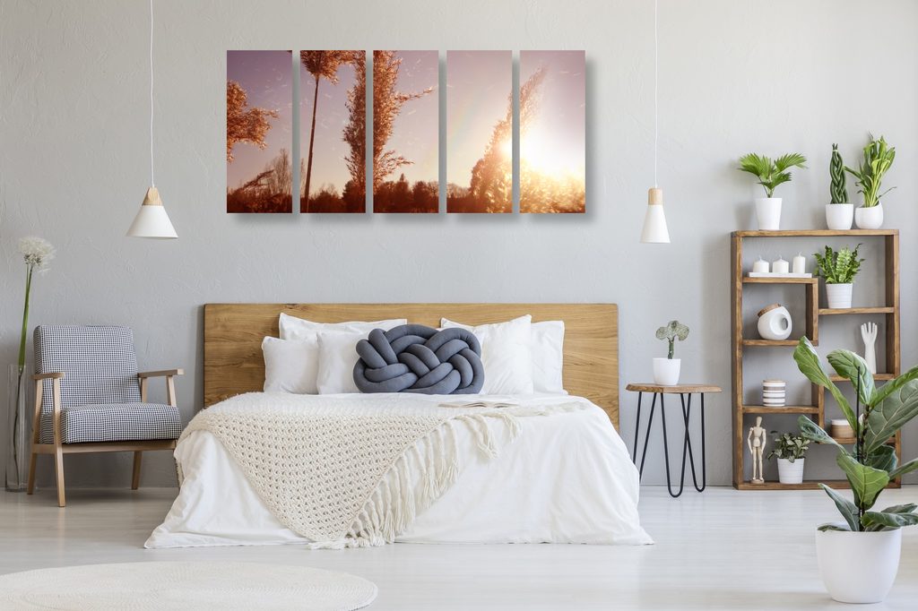5-dielny obraz steblá trávy pri západe slnka