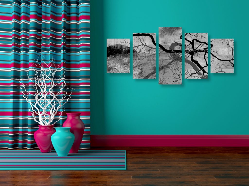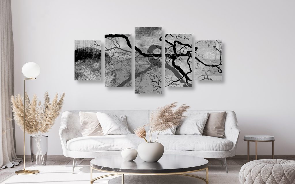 5-dielny obraz temné konáre stromu v čiernobielom prevedení