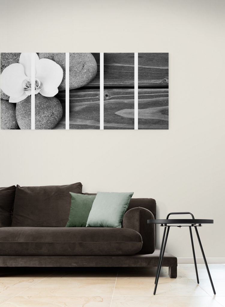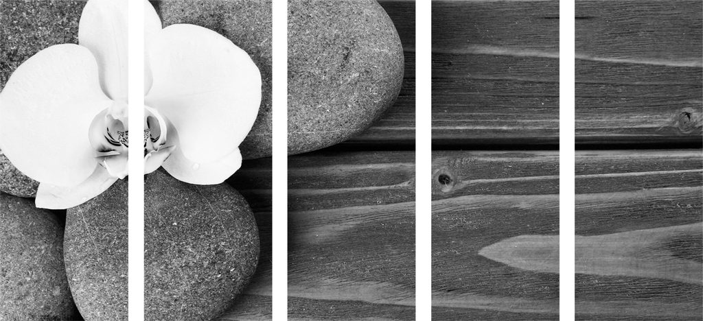 5-dielny obraz ukľudňujúce Zen zátišie s kvetmi orchidey v čiernobielom prevedení