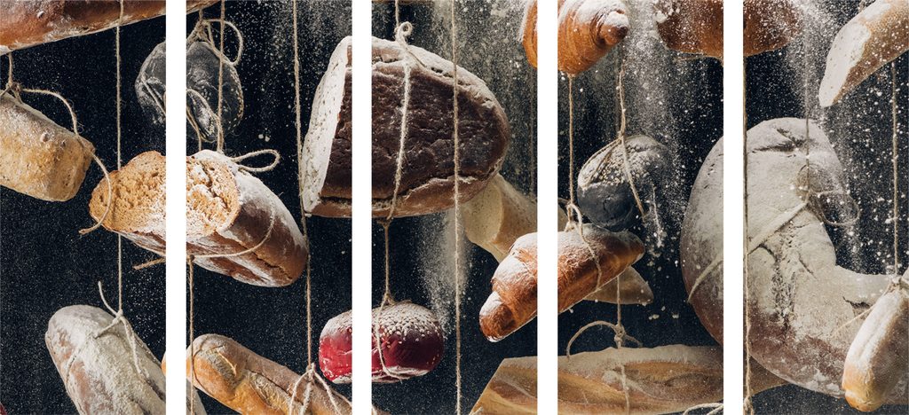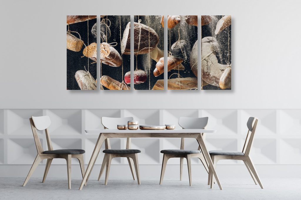 5-dielny obraz visiace pečivo v čiernobielom prevedení