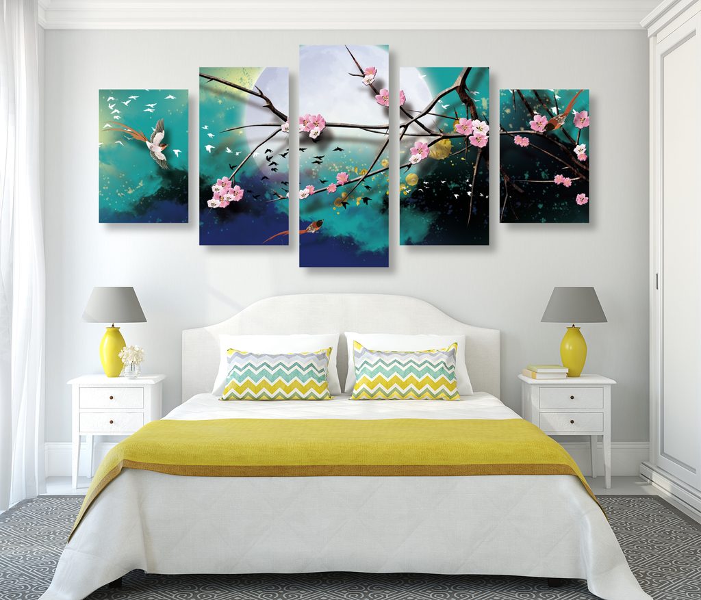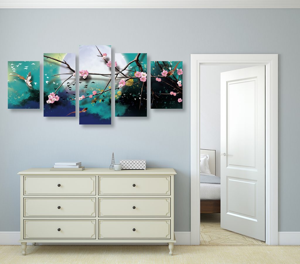 5-dielny obraz vtáčiky lietajúce za splnu mesiaca