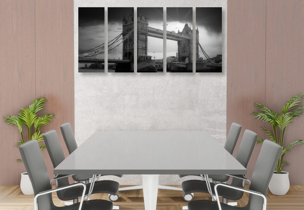 5-dielny obraz západ slnka nad čarovným Londýnom v čiernobielom prevedení