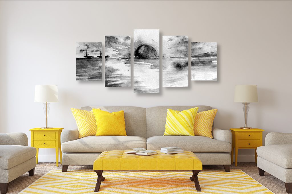 5-dielny obraz západ slnka za horizont v čiernobielom prevedení