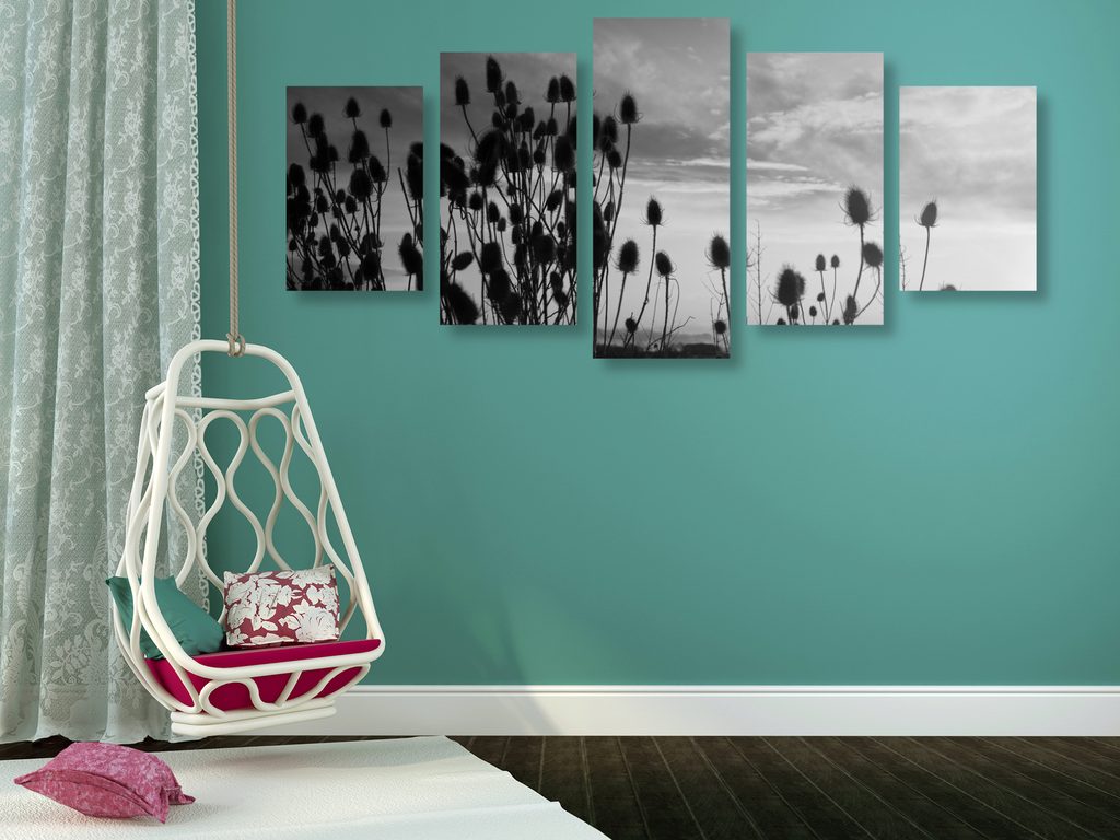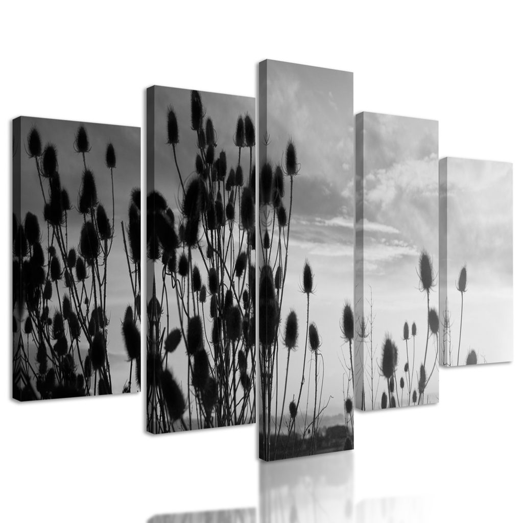 5-dielny obraz západ slnka za steblami trávy v čiernobielom prevedení