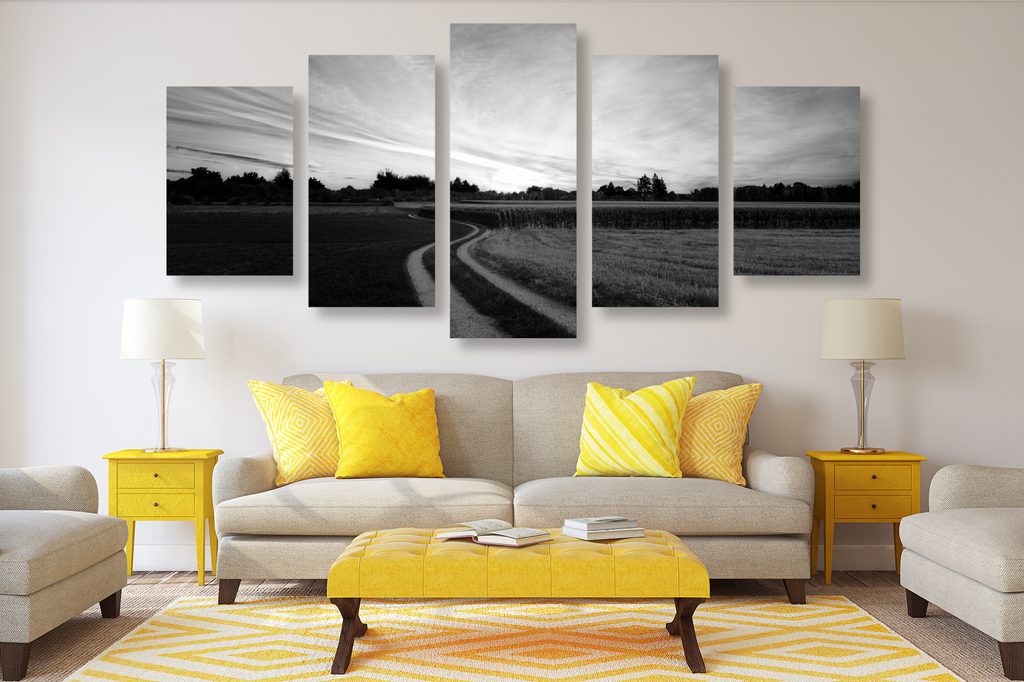 5-dielny obraz zapadajúce slnko nad krajinou v čiernobielom prevedení
