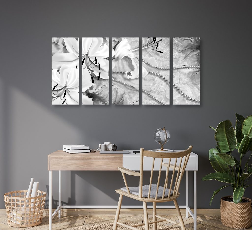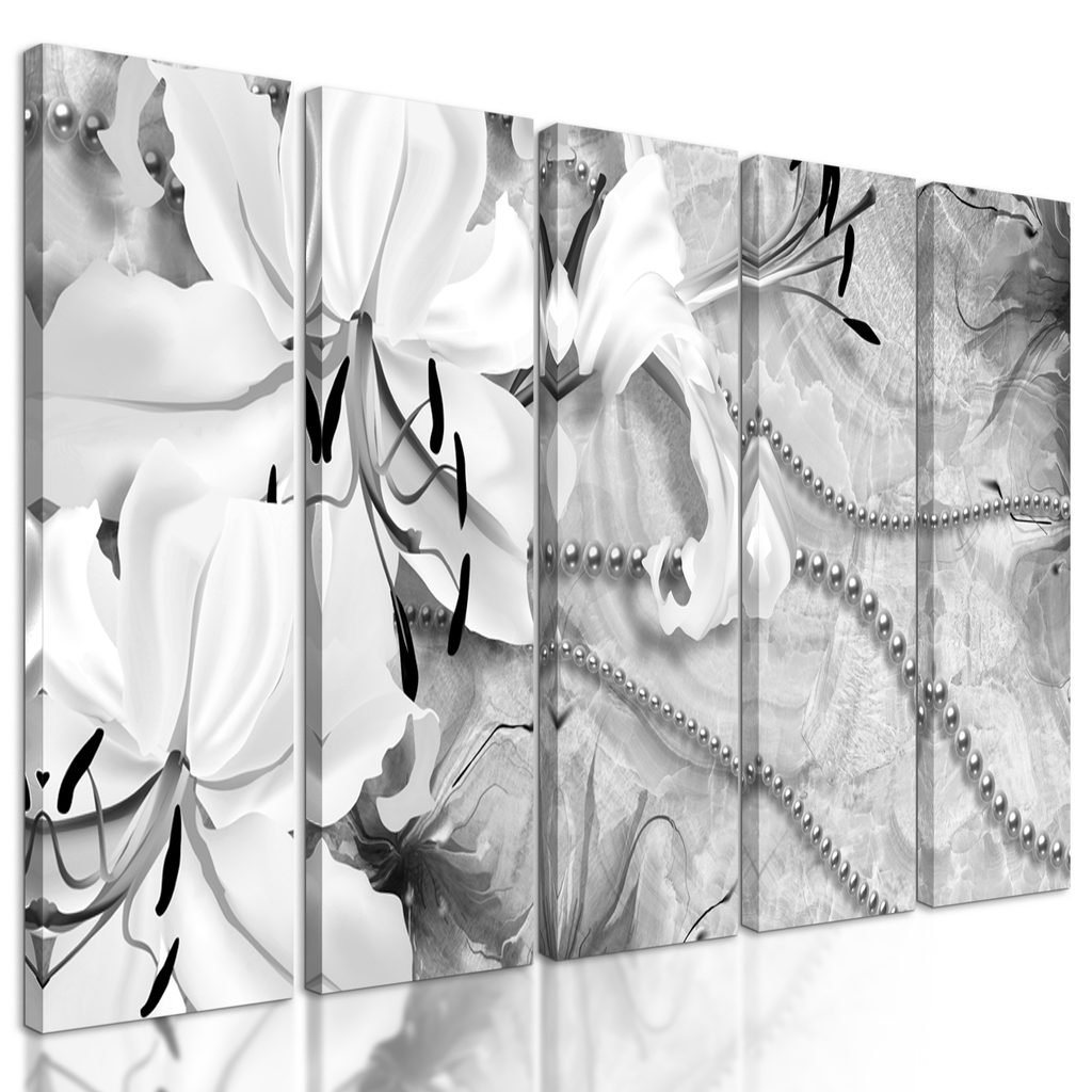 5-dielny obraz zátišie s ľáliami a perlami v čiernobielom prevedení