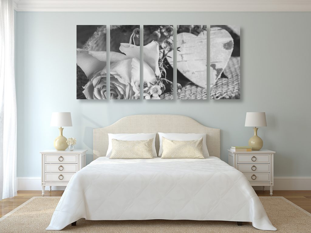 5-dielny obraz zátišie s ružou a srdiečkom v čiernobielom prevedení