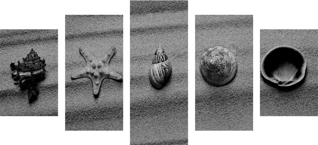 5-dielny obraz zátišie z mušlí na pláži v čiernobielom prevedení