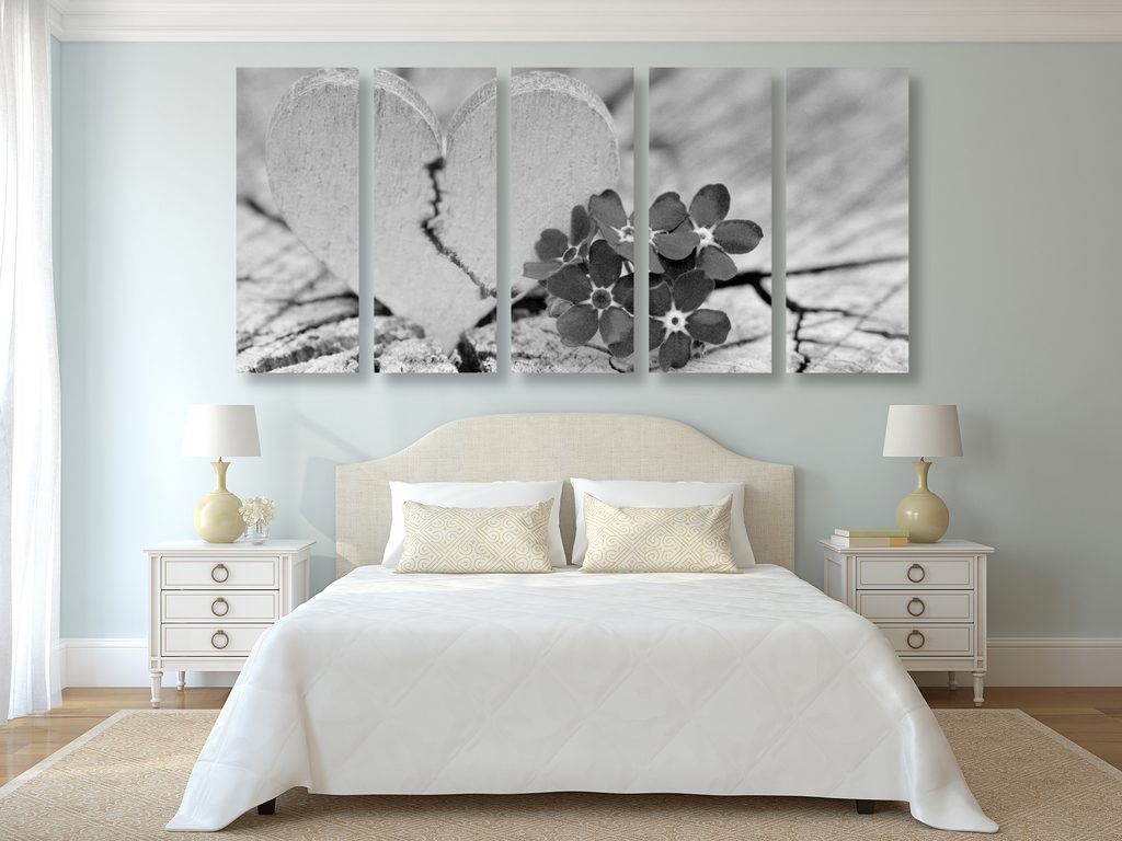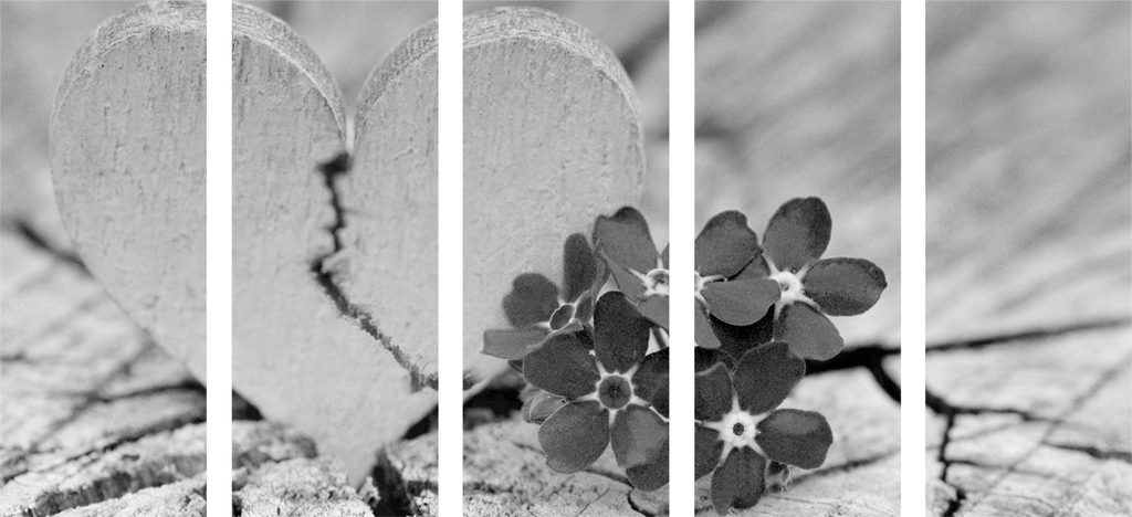 5-dielny obraz zlomené srdiečko v čiernobielom prevedení