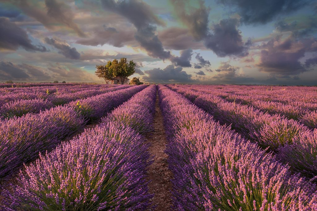 Originálna samolepiaca fototapeta levanduľové pole so stromom