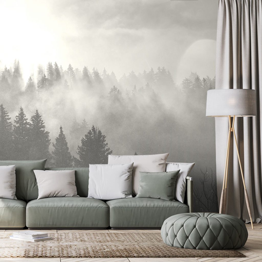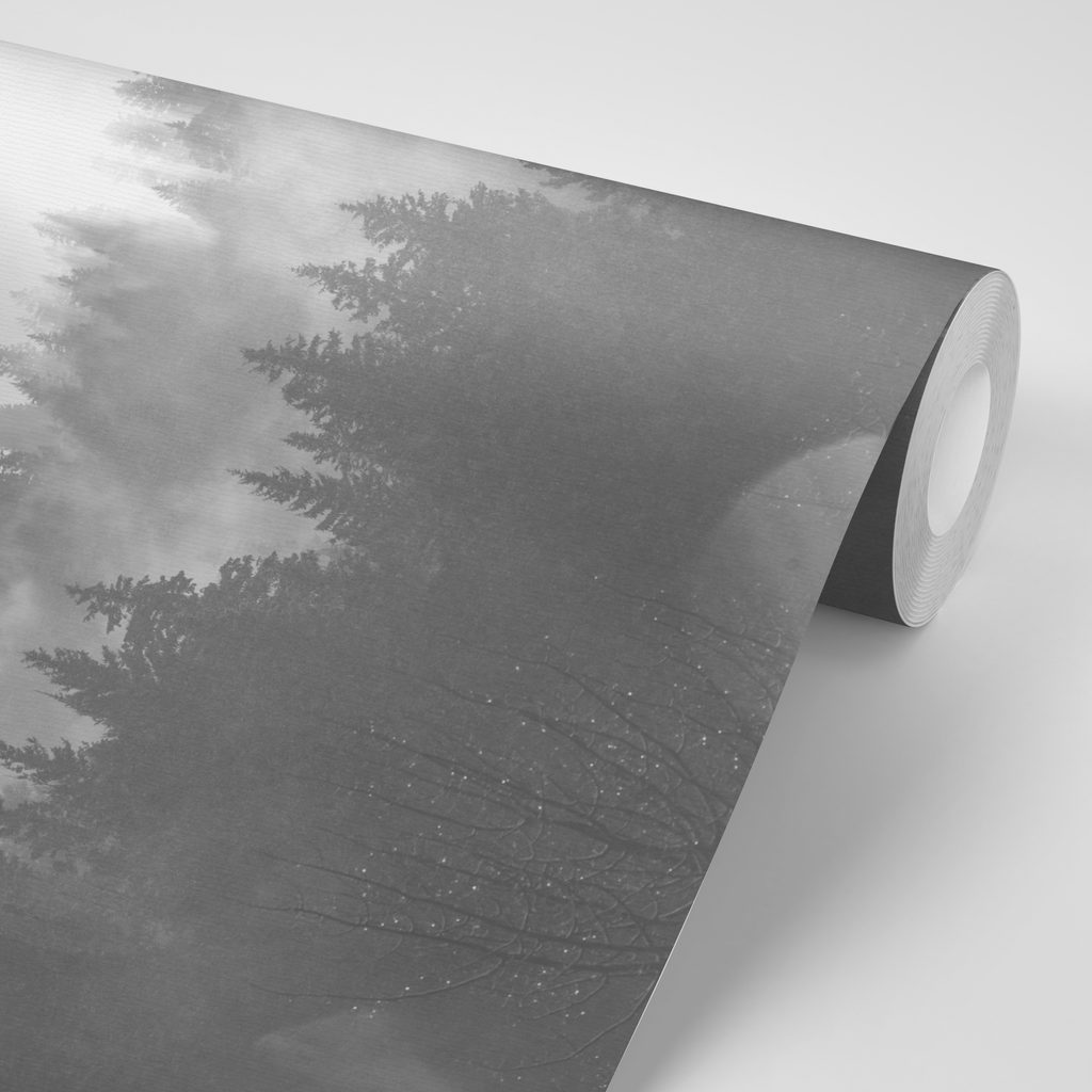Fototapeta ranné lúče slnka nad lesom v čiernobielom prevedení