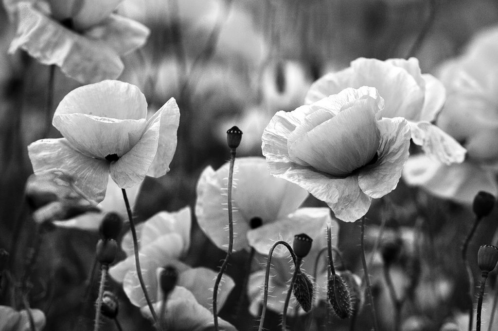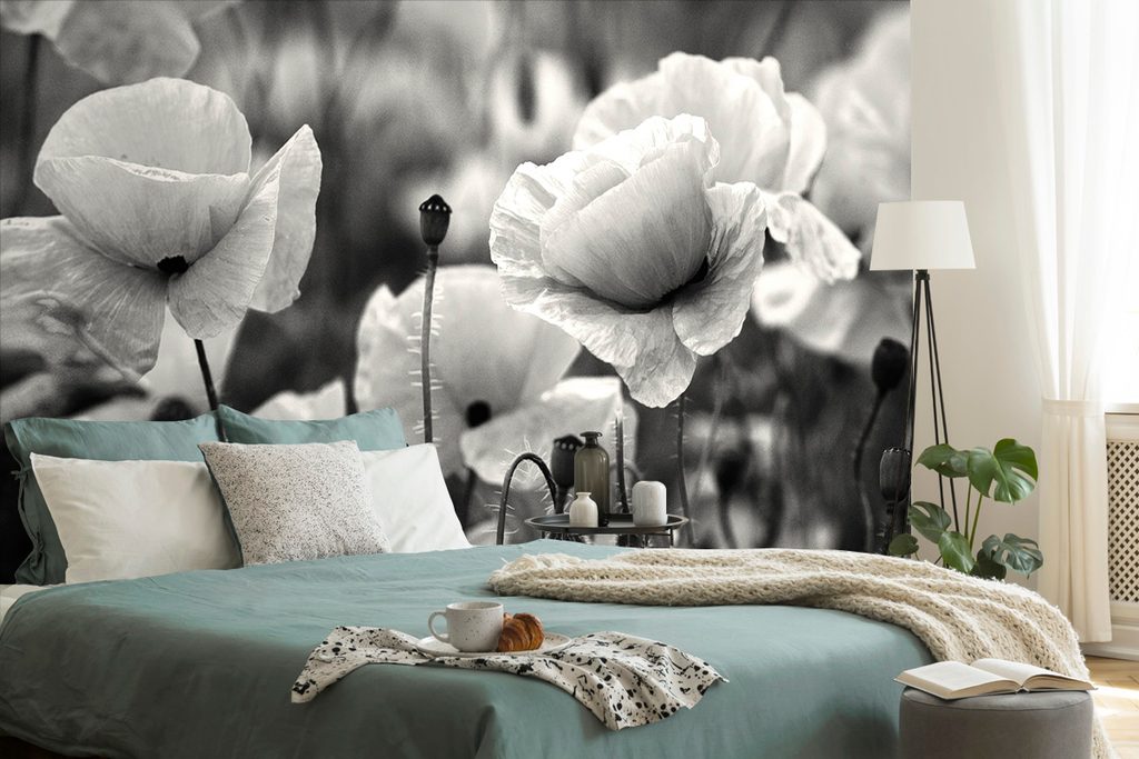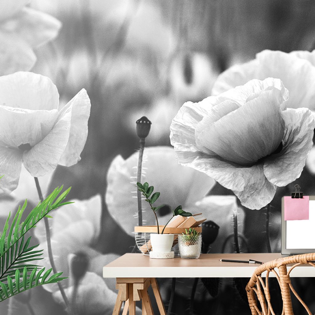 Nádherná čiernobiela samolepiaca fototapeta v objatí vlčích makov