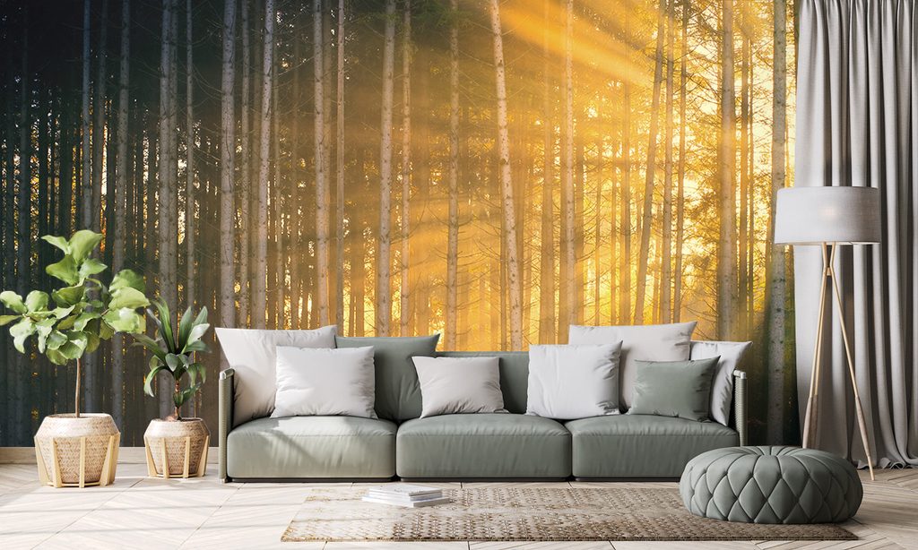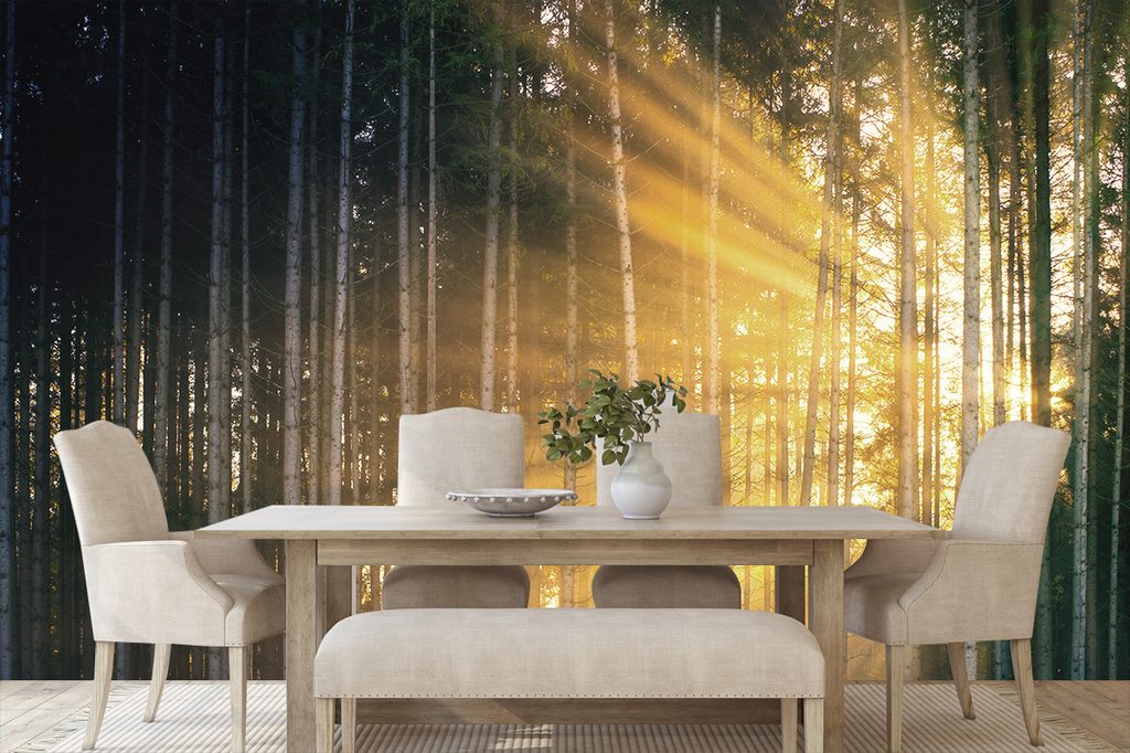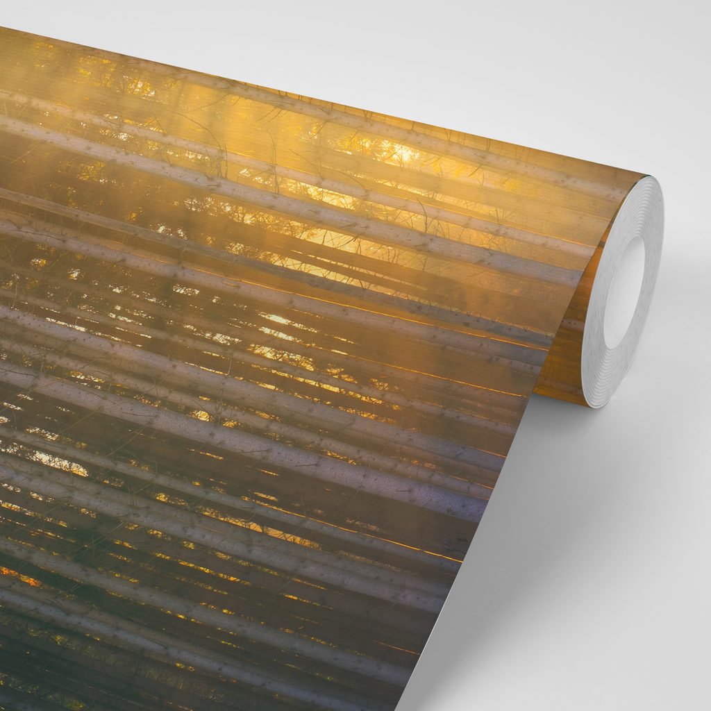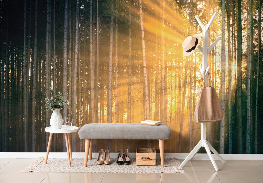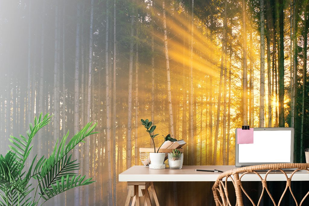 Nádherná samolepiaca fototapeta lúče slnka medzi stromami