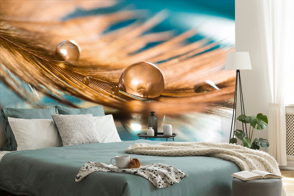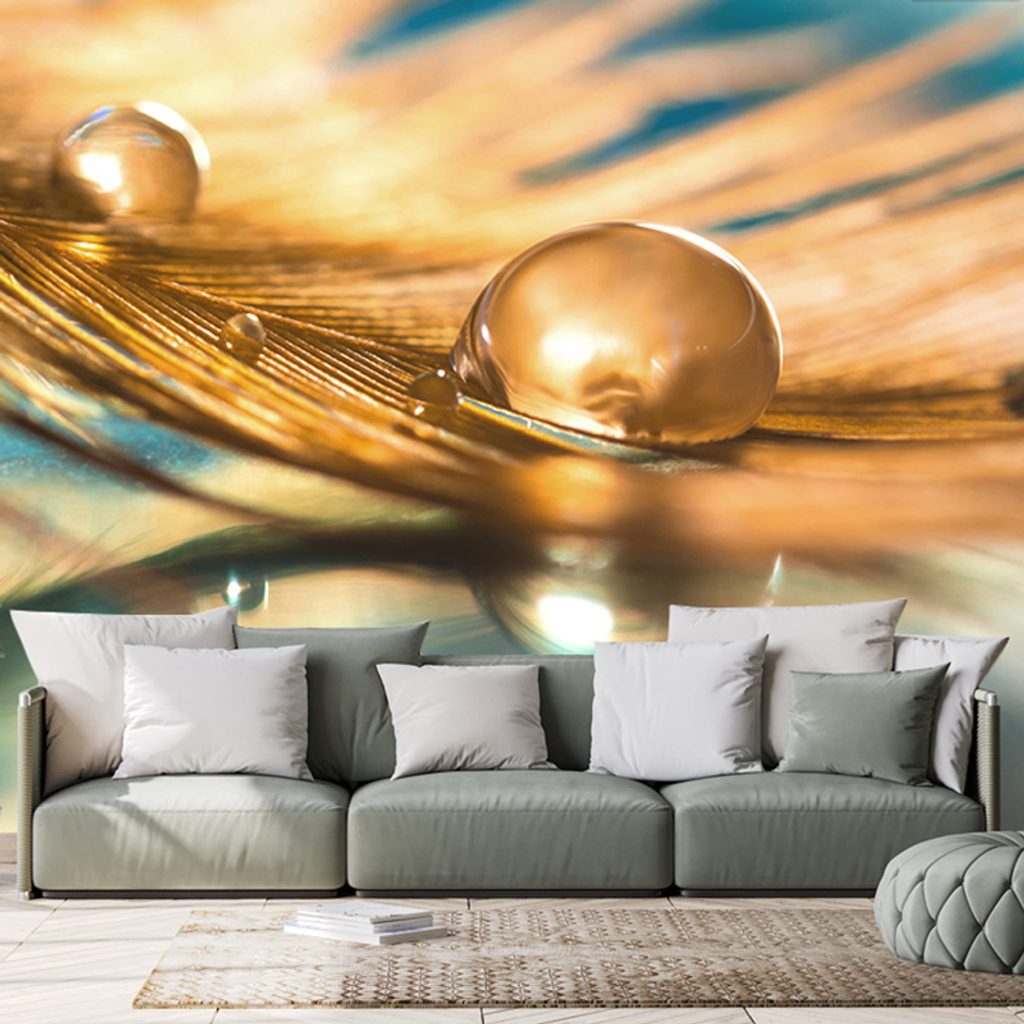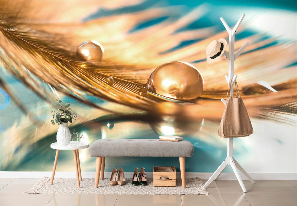 Nádherná samolepiaca tapeta zlaté pierko s kvapkou vody
