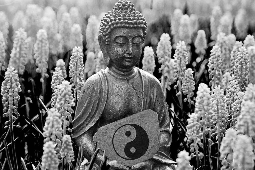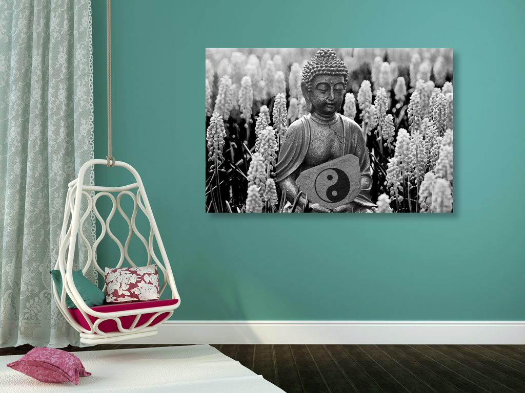 Obraz Budha na levandulovej lúke v čiernobielom prevedení
