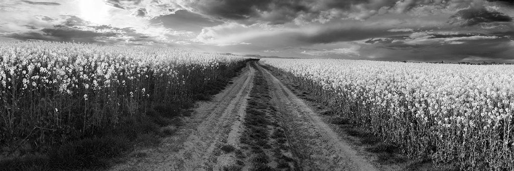 Obraz cesta v strede poľa v čiernobielom prevedení