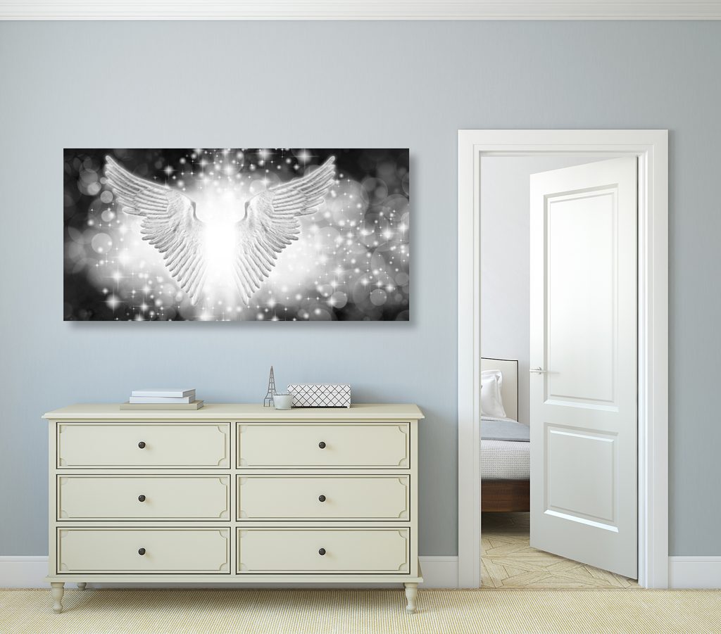 Obraz čiernobiele krídla anjela na abstraktnom pozadí