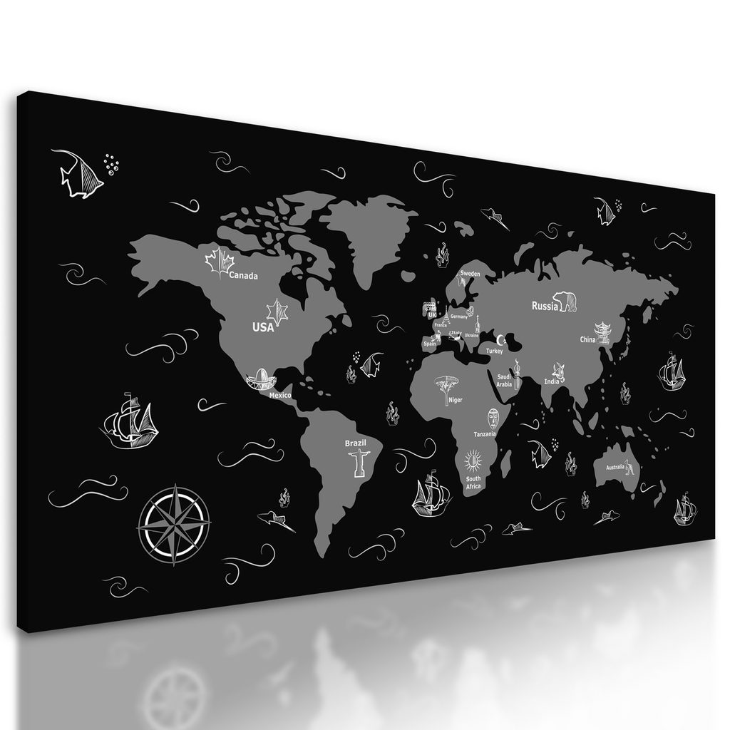 Obraz dobrodrúžna mapa sveta v čiernobielom prevedení