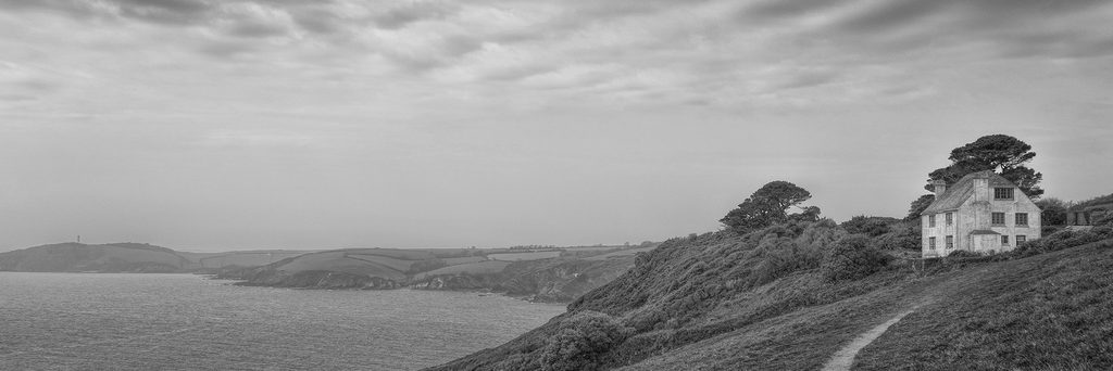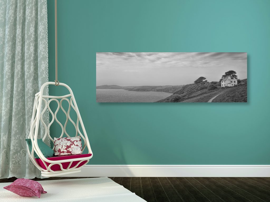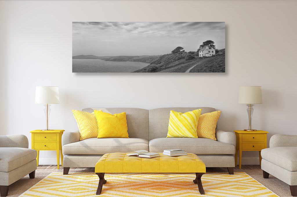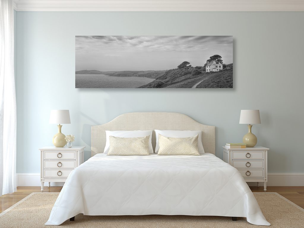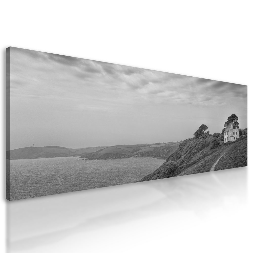Obraz dom pri mori v čiernobielom prevedení