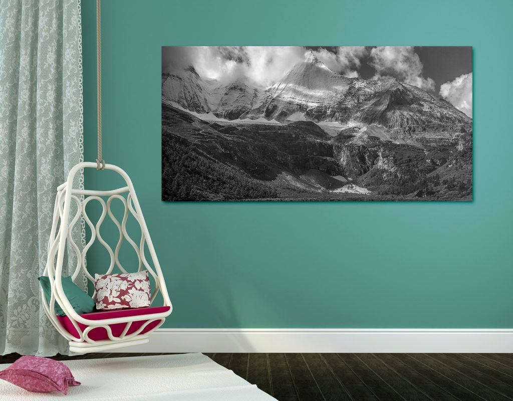 Obraz dychberúce hory v čiernobielom prevedení