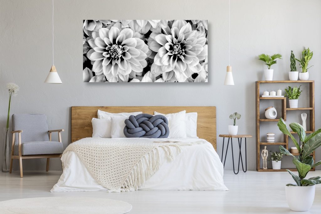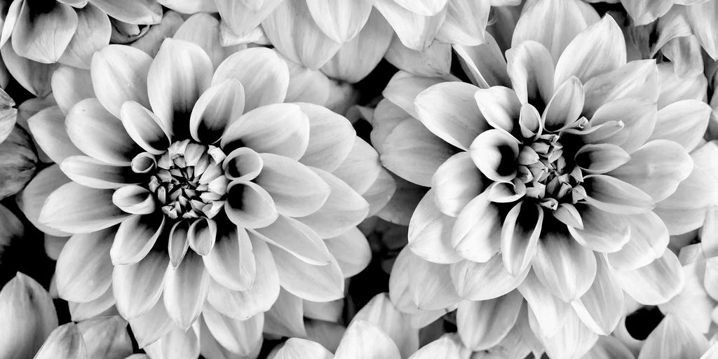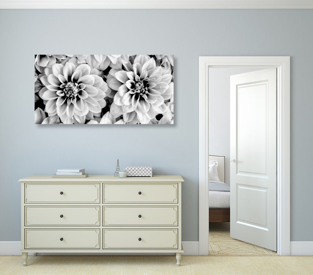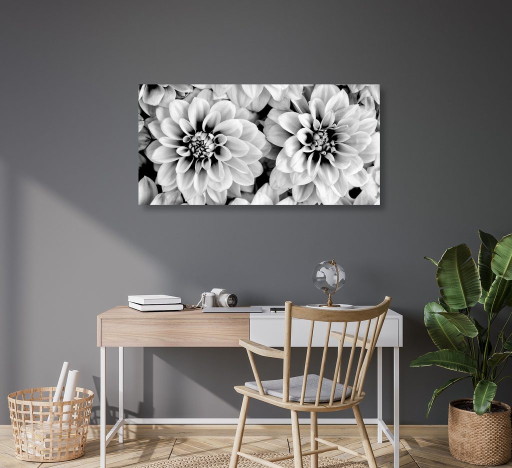 Obraz jemné rozkvitnuté dálie v čiernobielom prevedení
