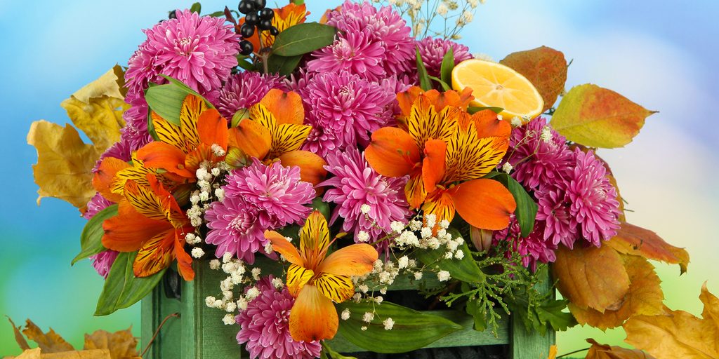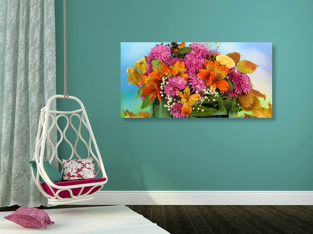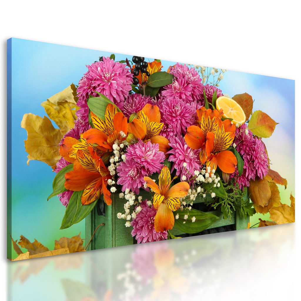Obraz jesenné zátišie drevená debnička plná kvetov