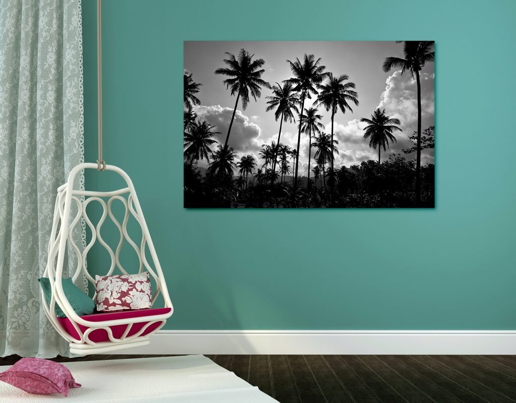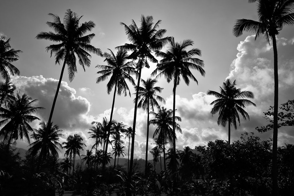 Obraz kokosové palmy v žiare slnka v čiernobielom prevedení