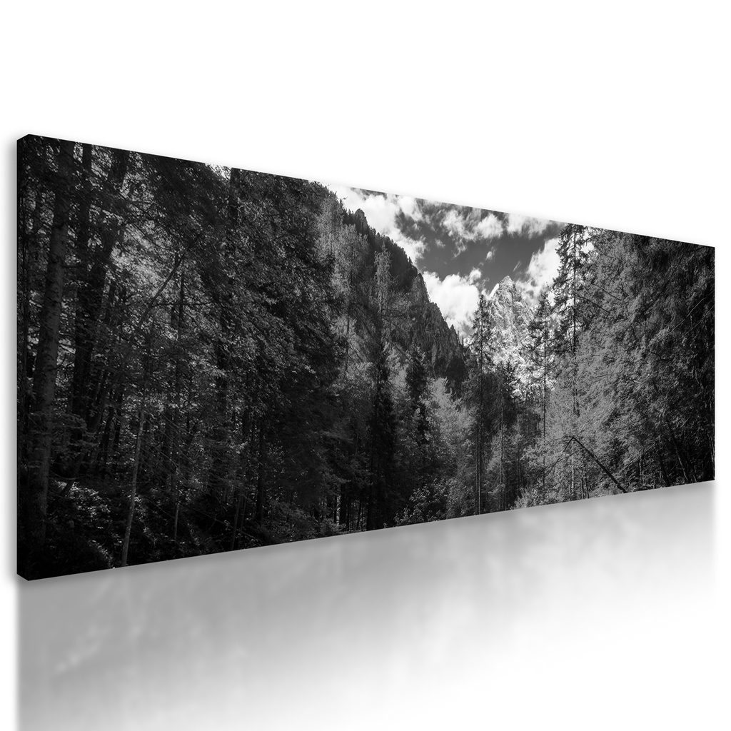 5-dielny obraz slnko predierajúce sa medzi korunami stromov v čiernobielom prevedení